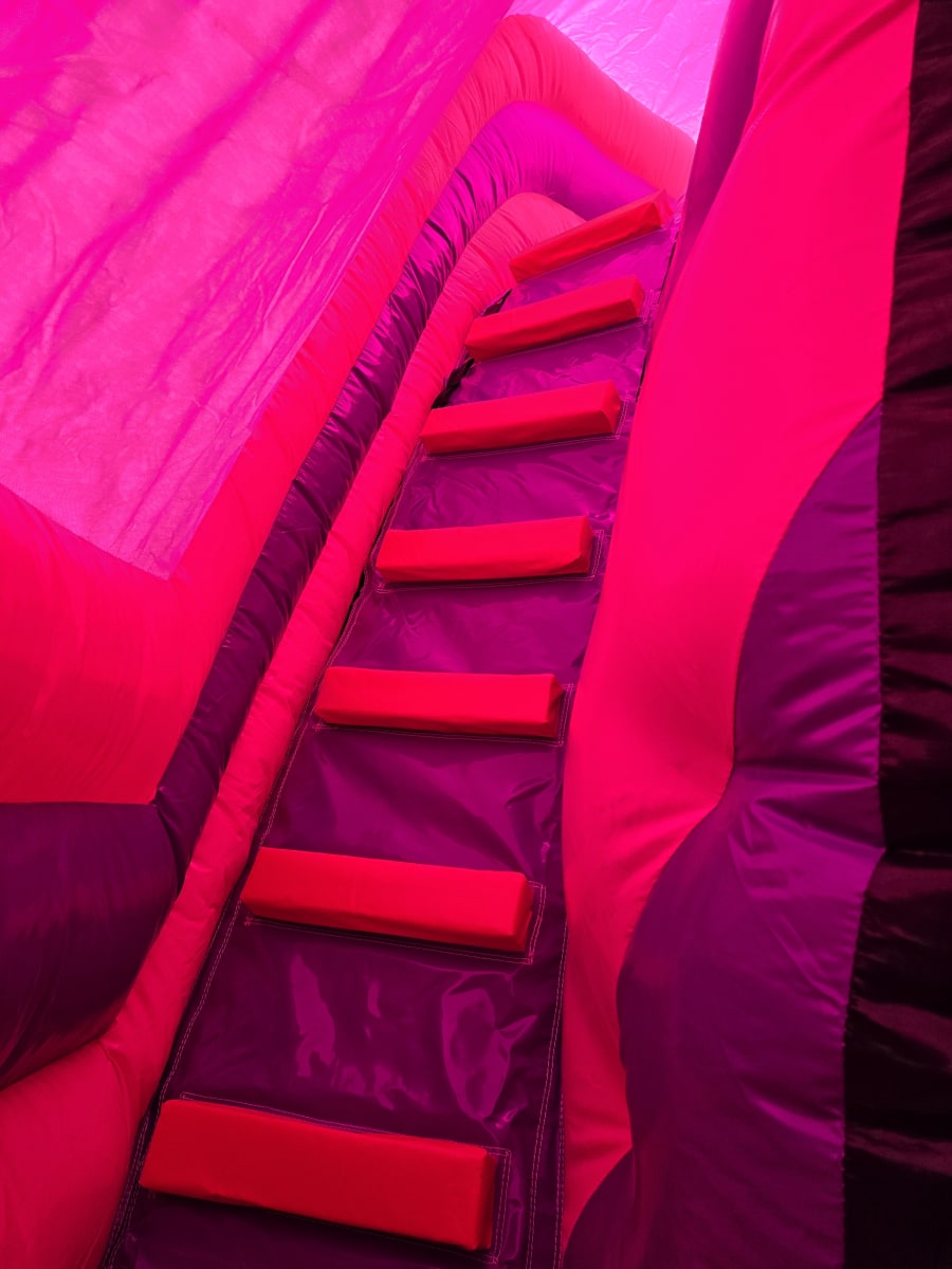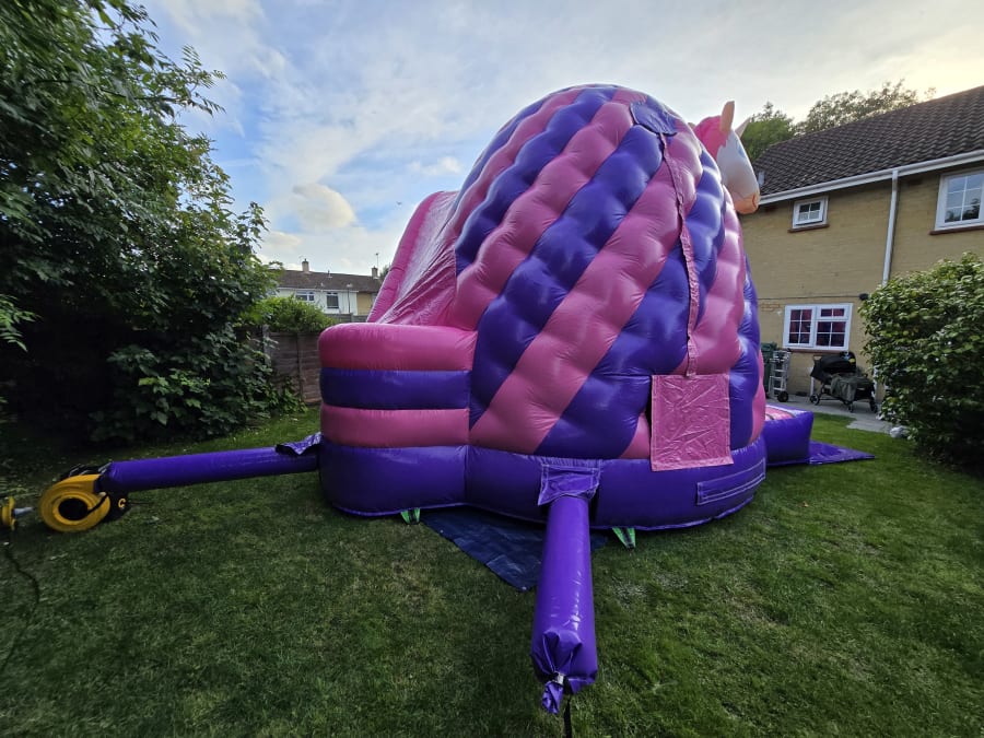 Our 3D Unicorn Dome with Slide is designed to captivate and entertain! The vibrant pink and purple colours, coupled with the enchanting unicorn theme, create a magical atmosphere that children will adore. The 3D unicorn head above the entrance adds a touch of fantasy, while the front-facing slide ensures that kids have a blast as they bounce and slide. Inside the dome, disco lights and music can be added for an extra layer of fun, transforming the bouncy castle into a lively disco party zone.