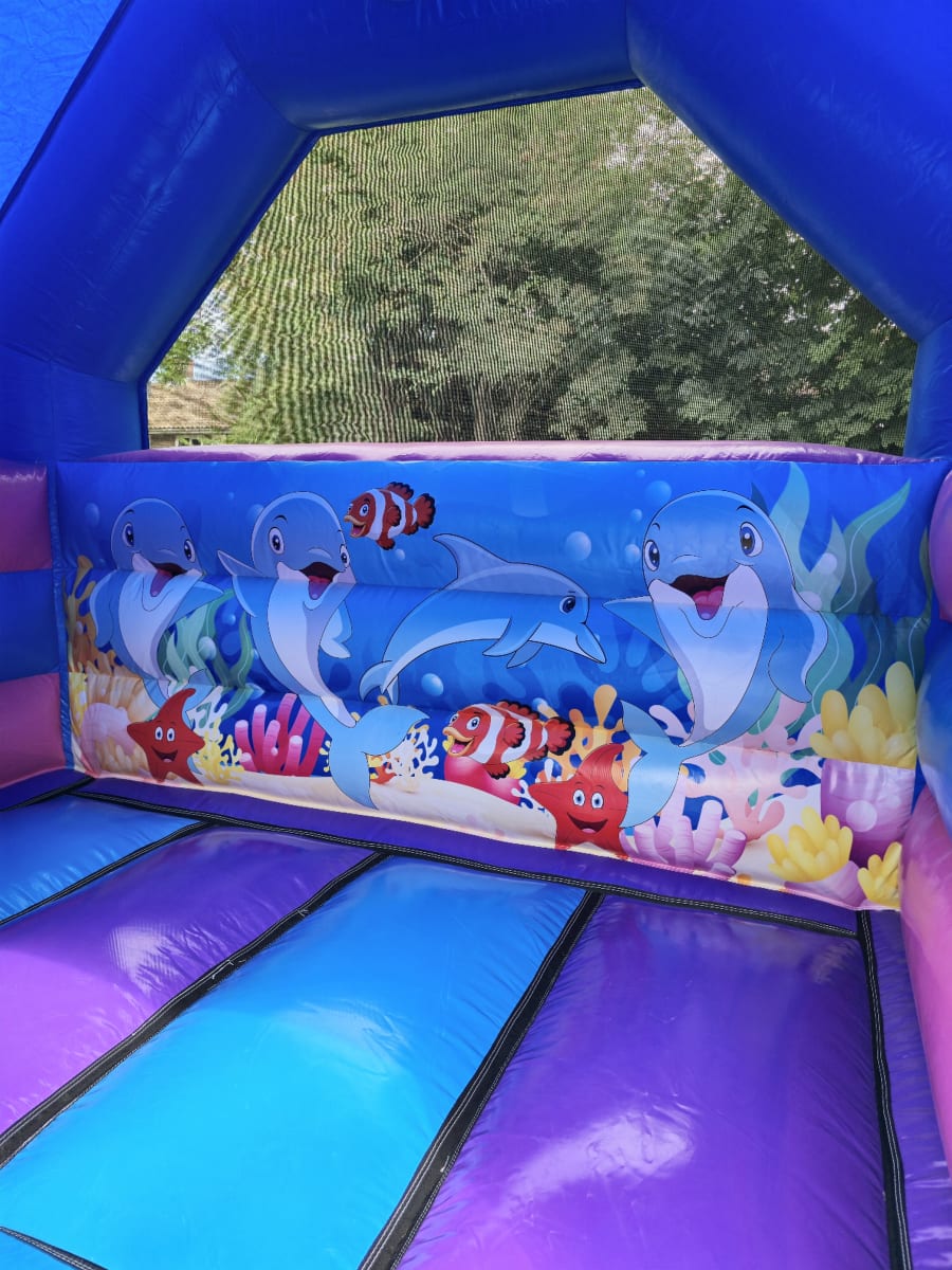 This enchanting bouncy castle boasts a whimsical 3D dolphin and captivating sea creature imagery, creating an immersive underwater world for children to explore. Let their imaginations run wild as they bounce, slide, and laugh in this undersea paradise!